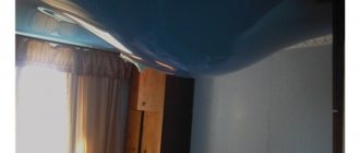 The mesh is primed with a latex-based composition, and after drying, using a wide spatula, the ceiling is plastered layer-by-layer with leveling mixtures - two layers with a cement-based composition, one layer with gypsum finishing putty. After the mixtures have dried, the ceilings are painted using a spray gun.